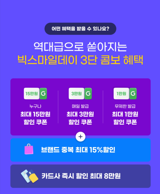 1) 1만원1만 원 이상 구매 시 최대 1만 원까지 할인되는 ‘15% 쿠폰’은 행사 종료 시까지 횟수 제한 없이 무한정 지급하며,