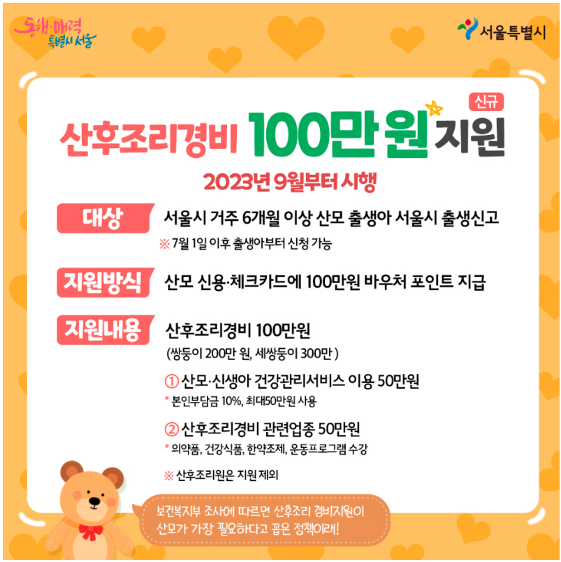 2023년 9월부터 서울시 거주 6개월 이상인 산모에게 산후조리경비 100만원을 지원합니다. 모든 출산가정에 임신출산 과정에서 겪게 되는 어려움을 덜어주고자 임신을 망설이는 분들이나 올해 하반기 출산을 계획하시는 분들에게 희소색이 될 만한 육아정책입니다. 지원요건에 해당되는 분들의 많은 관심과 신청 바랍니다.