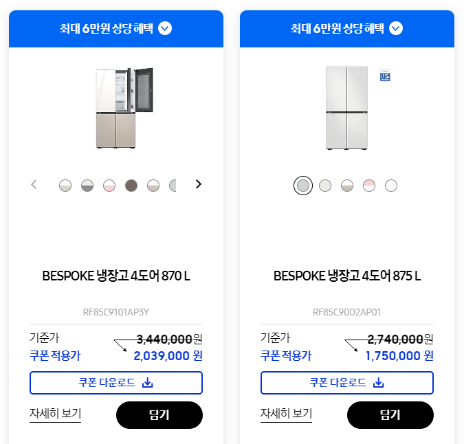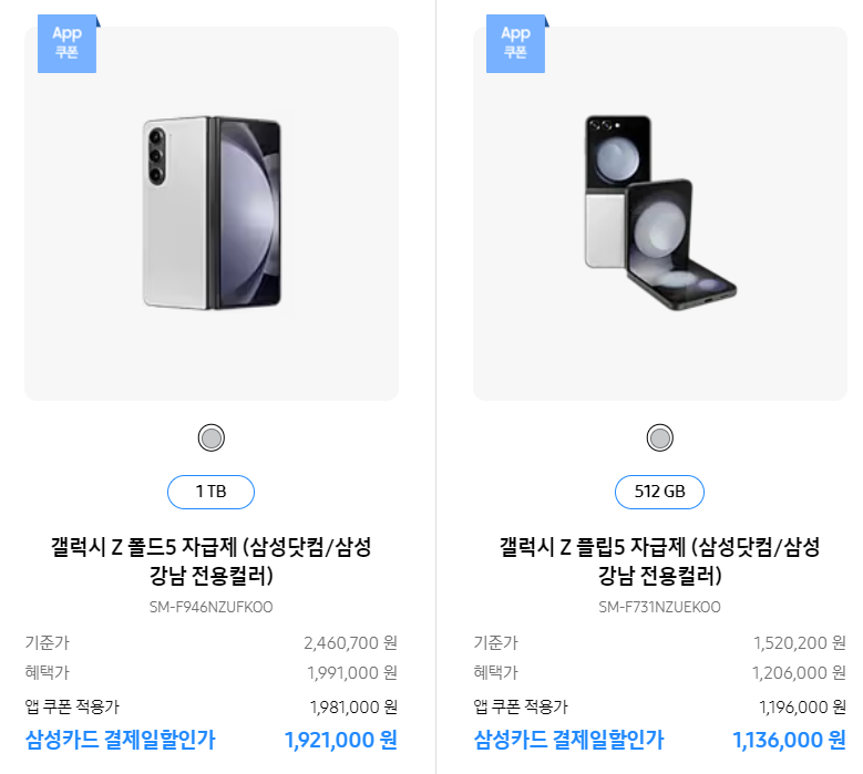 비스포크 그랑데 세탁. 건조기와 QLED TV는 대략 40% 할인으로 구매가 가능하며, 특히 갤럭시 Z 5시리즈 자급제폰은 온라인 최저가에 구매가 가능합니다. 쿠팡 자급제 폰 판매가 대비 대략 10만 원이 저렴한 가격이라 상당히 놀랍습니다.