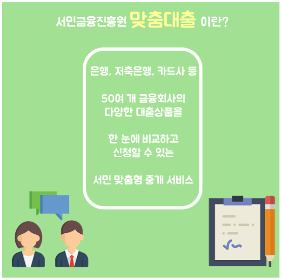 맞춤대출은 불법사금융 피해 예방을 위해 2005년 금융감독원과 금융기관이 공동 출자해 설립한 공적 대출중개회사인 ‘(사)한국이지론’으로부터 시작돼 2016년 준정부기관인 ‘서민금융진흥원’이 출범과 함께 이어받아 확대 운영하고 있습니다. 대출이 필요하지만 어디로 가야할지 몰라 고민하는 서민들에게 금융기관을 직접 방문하지 않고 인터넷, 모바일, 전화 상담을 통해 정책서민금융상품인 새희망홀씨, 햇살론, 사잇돌대출 및 민간 금융기관의 일반 신용대출 상품 등 은행, 저축은행 비롯한 69개 제휴사 180여개 상품을 전산 연계를 통해 대출가능 여부, 한도, 금리를 한 눈에 확인해 대출신청까지 가능하도록 돕고 있습니다.