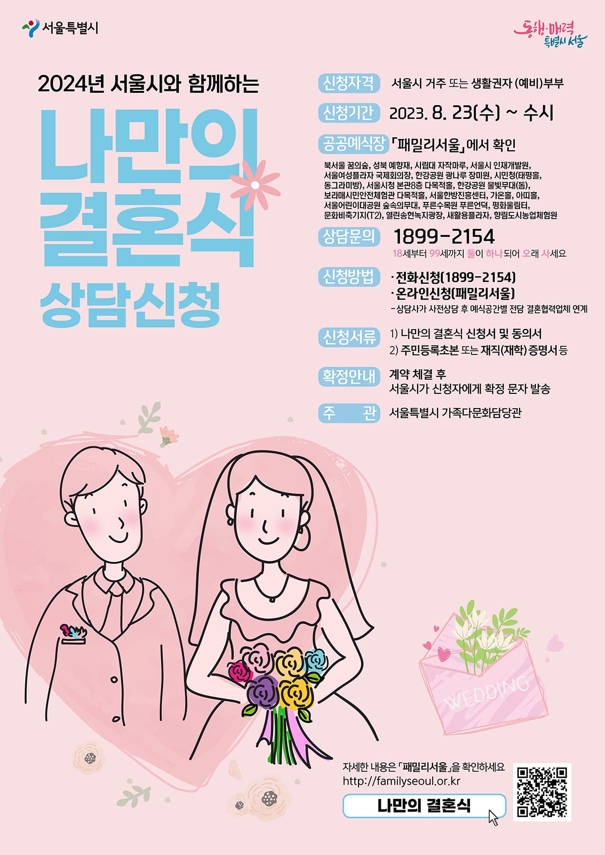 : 상단의 서울시 나만의 결혼식 상담예약 신청하기 버튼을 누르시면, 패밀리 서울 홈페이지로 접속되어 페이지 하단 온 라인 상담신청 후 예식공간 별 전담 플래너 업체와 종합상담을 통해하여 선택 후 최종 계약 가능합니다.