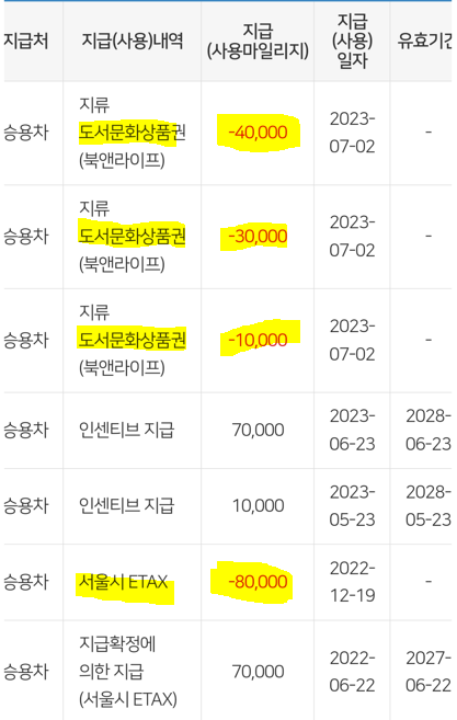 지급받은 마일리지는 기부, 현금전환 및 지방세납부, 온누리상품권, 모바일 도서문화상품권, 지류 도서상품권,