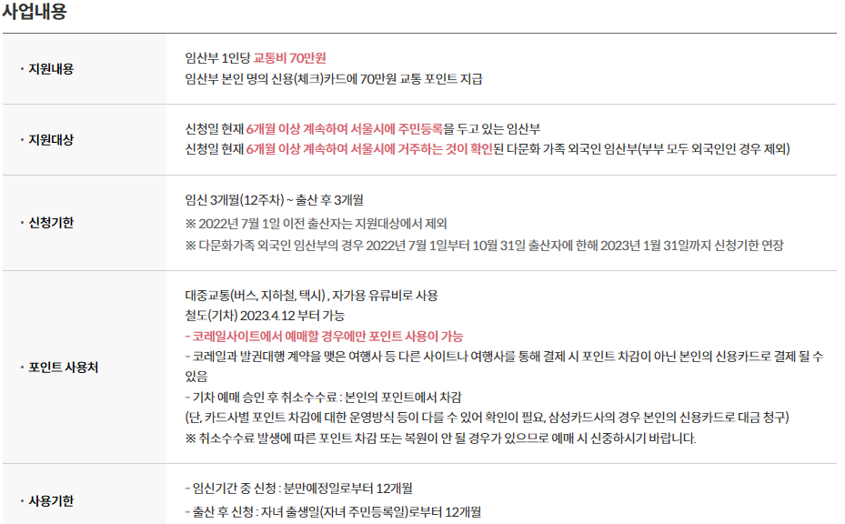 서울시 임산부 교통비 지급사업은 교통약자인 임산부에게 이동편의를 제공하여 건강한 출산을 지원하고, 출산가정의 경제적인 부담을 경감하여 안정적인 출산 환경을 조성하는 사업입니다. 임신기간 중 또는 출산 후에도 신청가능하며, 70만 원을 지원받을 수 있으니, 신청하여 혜택을 꼭 받으시길 바랍니다.