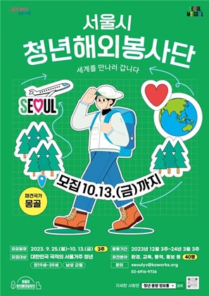 서울시에서 청년들의 국제개발협력사업 참여기회 확대 및 봉사활동을 통한 글로벌 역량 강화 지원을 위해 「2023년 서울시 청년해외봉사단」 1기 단원을 모집하고 있습니다. 청년들에게 봉사활동을 통한 해외 체류경험으로 글로벌 역량을 키우며, 향후 개인의 사회진출을 위한 양질의 밑거름이 될 정부지원사업으로 개인 부담금 없이 경험을 쌓을 수 있는 좋은 기회입니다. 많은 분들의 지원이 있었으면 합니다.