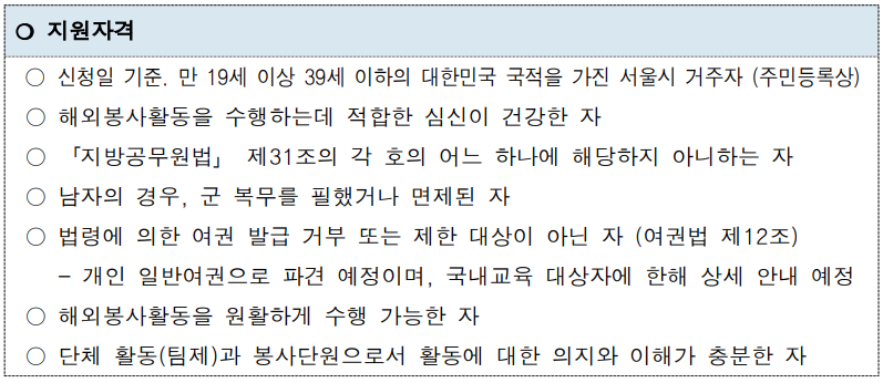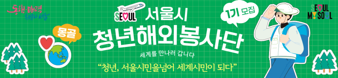이번 서울시 해외청년봉사단은 서울시에서 처음으로 시행하는 사업입니다. 1기 라는 자부심도 함께 가질 수 있으며, 무엇보다 자기 부담금 없이 해외경험을 쌓을 수 있는 좋은 프로그램으로 많은 서울 청년분들 신청하시어 선정되시길 바랍니다.