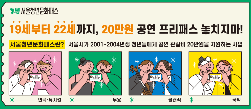 - 모든 공연이 대상이 되는 것이 아니며 서울 청년문화패스 전용 홈페이지를 통한 공연 및 관람만 지원 대상이 됩니다.