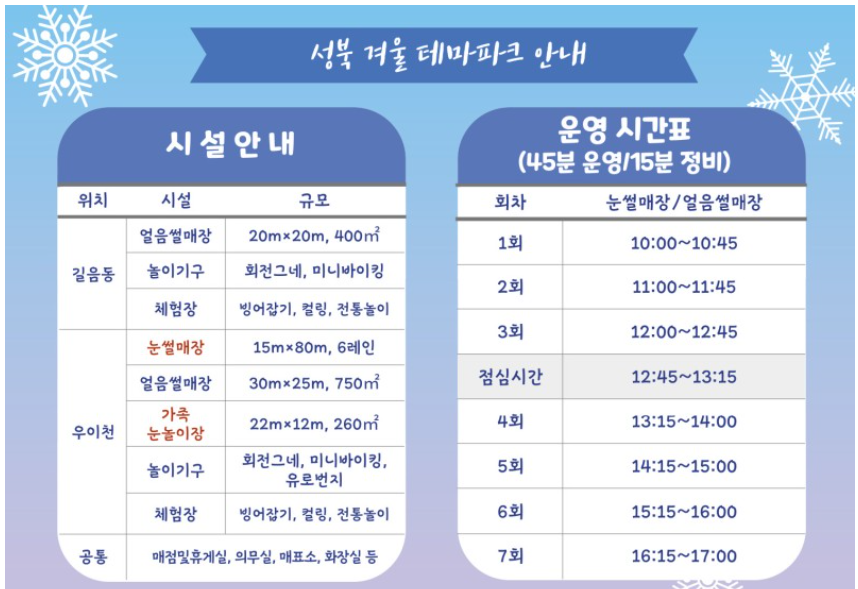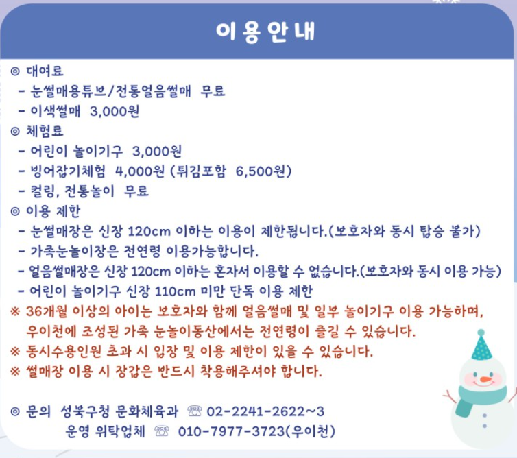 - 얼음썰매장 : 신장120cm 이하는 이용제한(보호자와 동시탑승 가능)