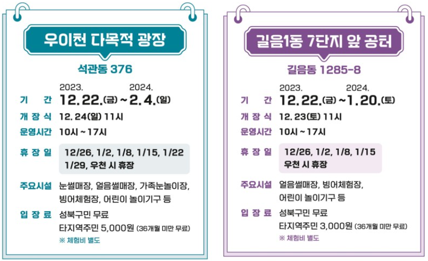 크리스마스가 지나면서 본격적인 아이들의 겨울방학이 시작이 되었습니다. 지난여름 성북구 테마파크 수영장에 이어 이번에는 성북구 겨울테마파크가 우이천 다목적 광장과 길음1동 7단지 앞 공터 두 곳에서 구민과 아이들을 위한 겨울놀이 테마파크가 지난 22일 오픈하였습니다. 얼음썰매, 튜빙눈썰매와 빙어체험 및 놀이시설등이 갖추어진 우이천 다목적 광장의 겨울테마파크 개장에 대한 정보를 알려드립니다.