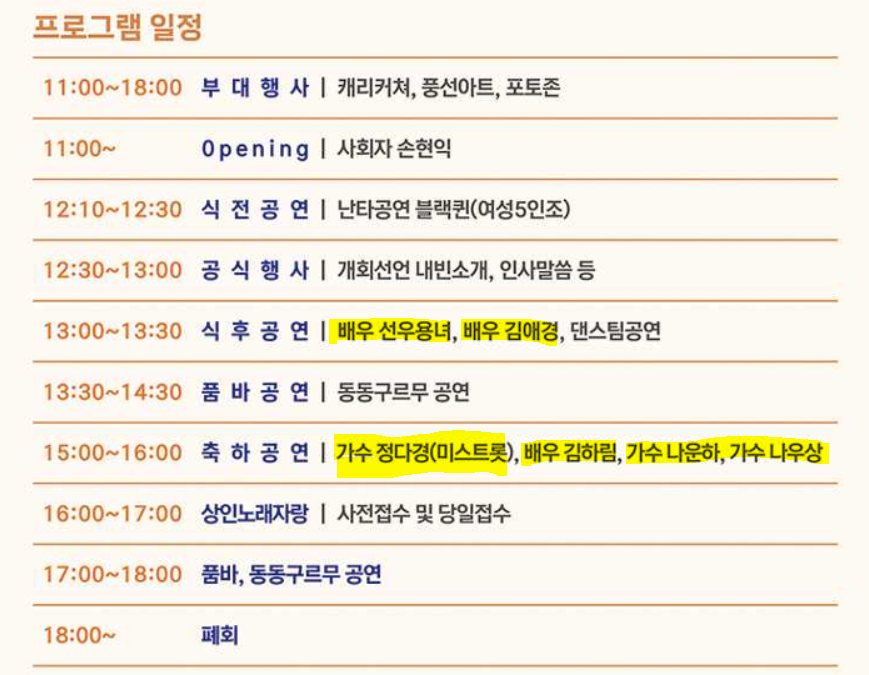 성북구 관내 시장에서 운영하는 각종 부스와 다채로운 문화행사가 계획되어 있다고 합니다. 인기가수 미스트롯 정다경과 배우 선유용녀, 김애경 등이 축제에 함께 한다고 하니, 많은 주민들이 함께하여 축하무대 공연과 함께 축제의 장을 즐기시길 바랍니다.