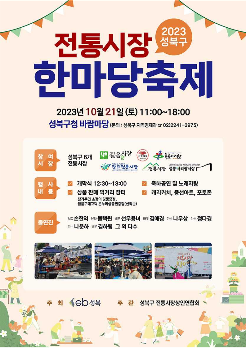 "2023 성북구 전통시장 한마당축제" 행사가 2023년 10월 21일 토요일에 성북구청 바람마당에서 진행됩니다.