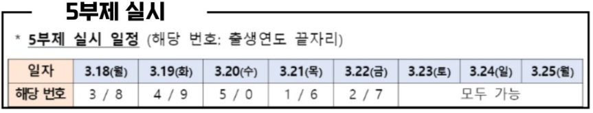 3월 18일부터 온·오프라인을 통해 신청이 가능하며, 신청기간은 연중 분기별로 시행할 예정입니다. 초기에는 신청수요가 한꺼번에 몰려 차질이 발생하지 않도록 5부제를 실시할 예정이고, 신청자의 출생연도 끝자리를 기준으로 18일에는 3·8, 19일 4·9, 20일 5·0, 21일 1·6, 22일 2·7인 사람만 신청할 수 있으며, 23일부터는 누구나 가능합니다.