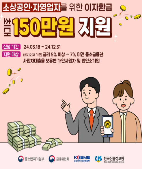 정부가 대출을 받은 소상공인의 이자 부담을 덜기 위해 이자 환급을 실시합니다. 높은 금리와 경기회복 지연으로 어려움을 겪는 소상공인의 금융 부담을 덜어주기 위한 조치이며, 2 금융권 저축은행·여전사 등 중소금융권에서 금리 5% 이상 7% 미만의 사업자 대출을 받은 소상공인이라면 최대 150만 원의 이자를 환급받을 수 있습니다. 이자환급 신청 접수가 3월 18일부터 시작된다고하니, 신청 및 조회 방법에 대해 알아보도록 하겠습니다.