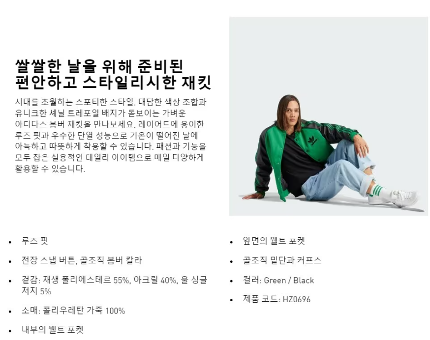 - 제품명 : 아디다스 오리지널 : 봄버 재킷 HZ0696 아디다스오리지널 데일리 루즈핏 바시티재킷 봄버재킷 그린/블랙