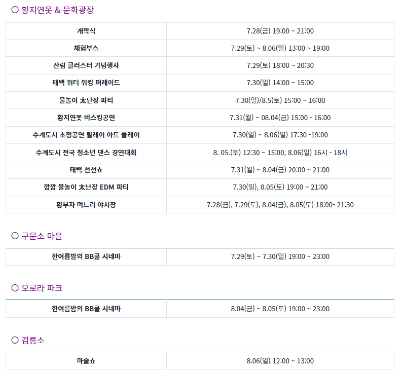 인기가수 축하공연, 물놀이 파티, 쿨시네마, 퍼레이드, 다양한 공연 등 누구나 부담없이 즐길 수 있는 준비를 마쳤다고 합니다. 일찍 시작된 더위를 시원하게 날려버릴 태백 선선페스티벌에서 피서와함께 태백의 매력에 한층 더 빠져 보시기 바랍니다.