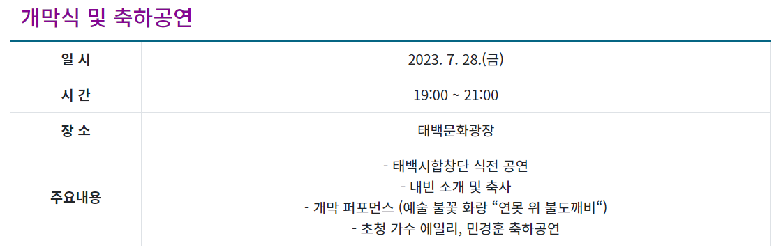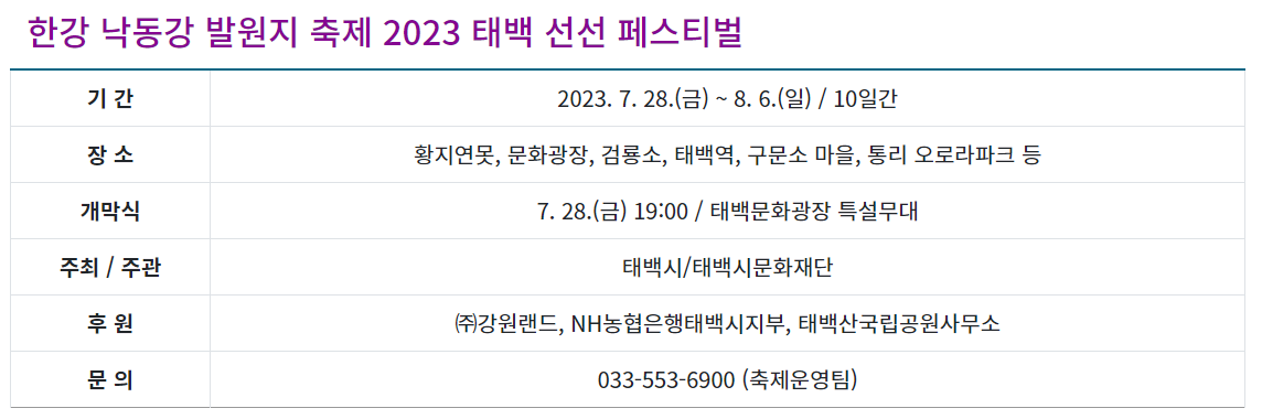 대한민국에서 가장 시원한 도시 태백에서 열리는 제 8회 한강ㆍ낙동강 발원지 축제가 '2023년 태백 선선 페스티벌'이라는 새로운 이름으로 개최됩니다. 한여름의 더위가 최고조인 7월 28일부터 8월 6일까지 열흘간 태백의 황지연못, 검룡소, 구문소, 통리 오로라 파크 등 태백시 곳곳에서 다양한 프로그램과 인기가수 송가인, 김희재, 에일리 등의 공연도 즐길 수 있습니다.