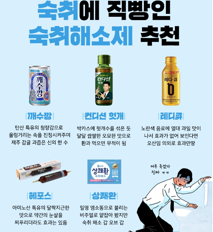 아무쪼록 연말연시 각종모임 술자리 숙취로 고통을 예방할 수 있는 숙취해소제는 음주 전후 개인사정을 고려하여 기호에 맞게 선택하시는 것을 추천드리며, 지나친 음주는 건강을 해친다는 점과 숙취해소제는 약이 아니라, 건강음료 및 기능식품이라는 것을 인지하시기 바랍니다.