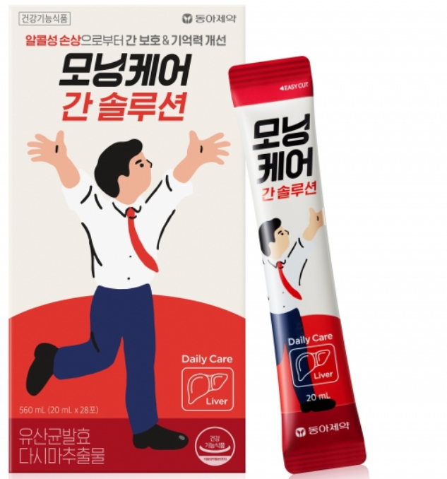 동아제약에서 나온 모닝케어는 기존의 드링크 제품이 인기가 많으며, 최근에 '모닝케어 간 설루션'으로 스틱형의 숙취해소제가 출시되었습니다. 알코올성 간 손상 회복 기능을 인정받은 유산균 발효 다시마 추출물을 원료로 만들었다고 합니다.