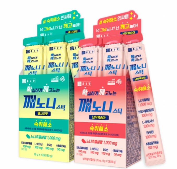 종근당에서 출시된 젤리 형태 숙취해소제 ‘깨노니 스틱’ 배사과맛과 납작 복숭아맛이 있으며 숙취 효능에 관한 제조 공법 특허를 받은 노니트리가 이 제품의 주된 원료라고 합니다.
