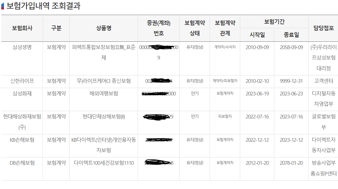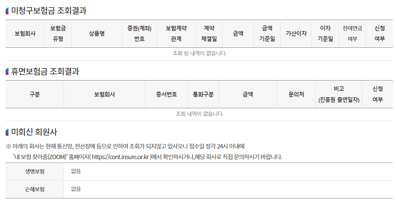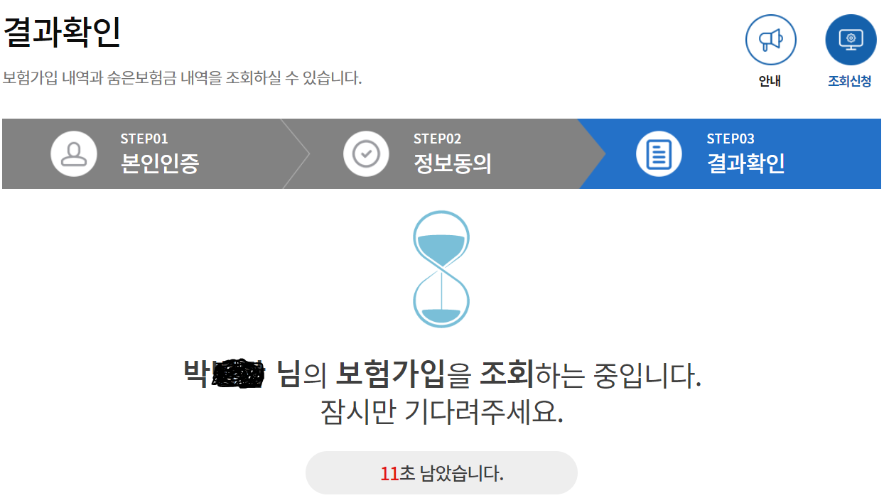 대략 30초 정도 후에 본인의 보험가입내역 조회결과와 미청구보험금, 휴면보험금의 조회결과를 확인할 수 있습니다.