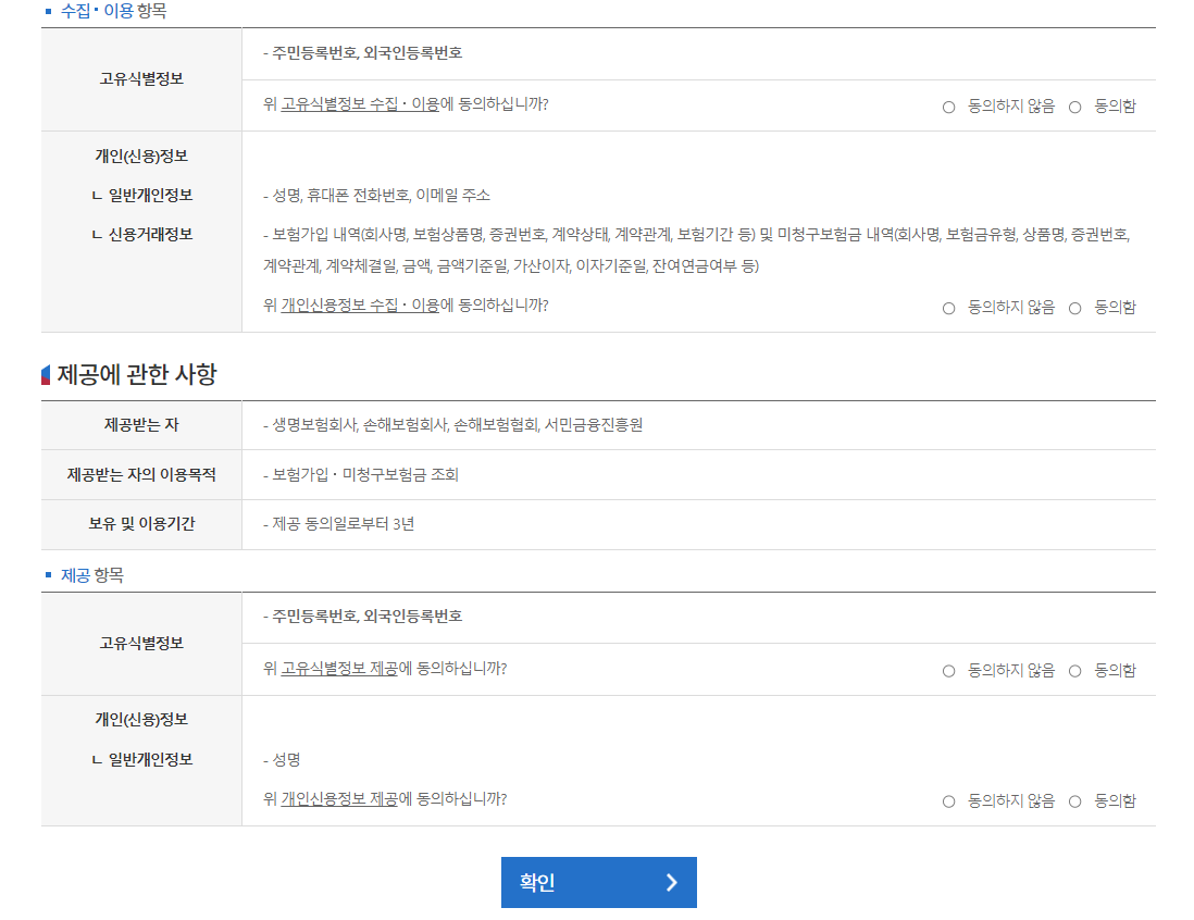 수집.이용항목 및 제공에 관한 사항 모두 동의에 체크 후 확인버튼을 클릭 합니다.