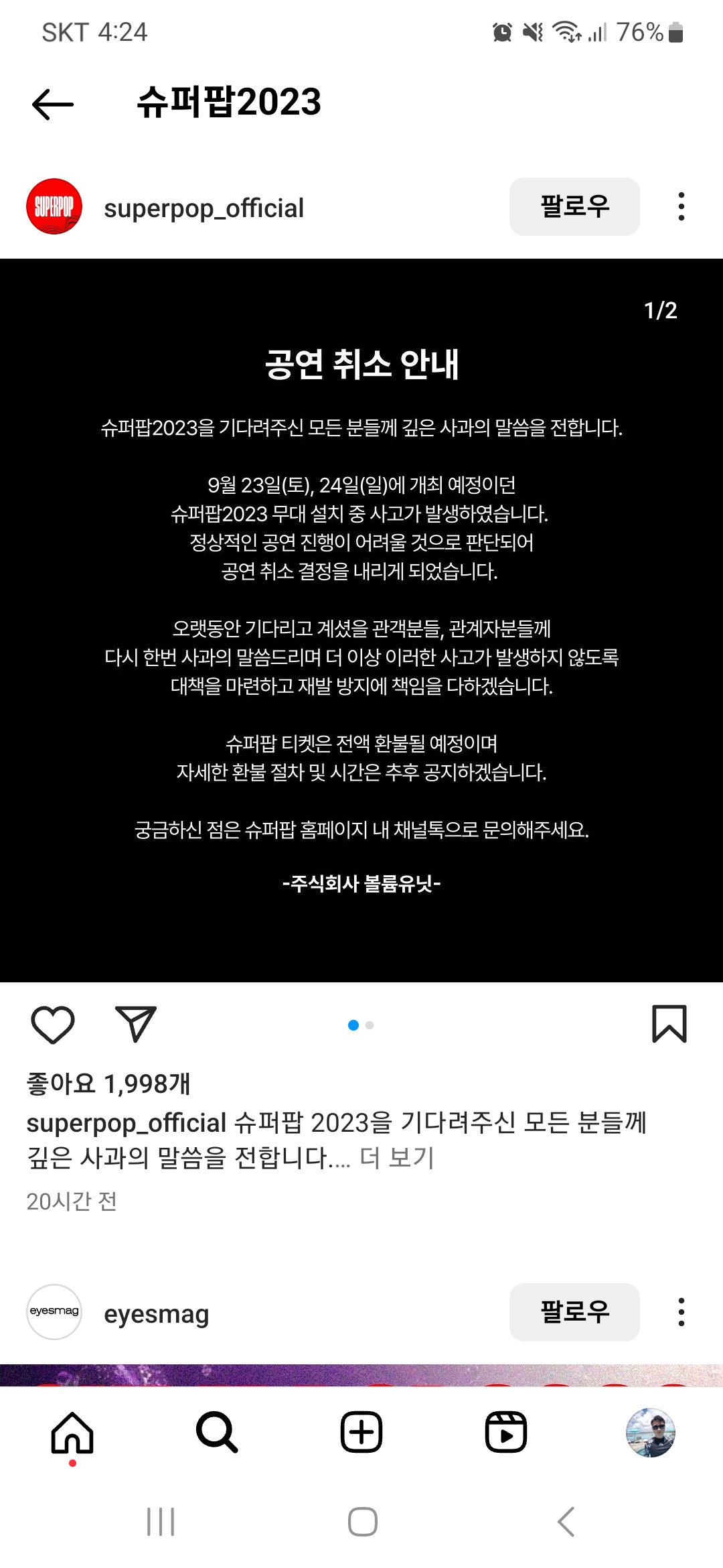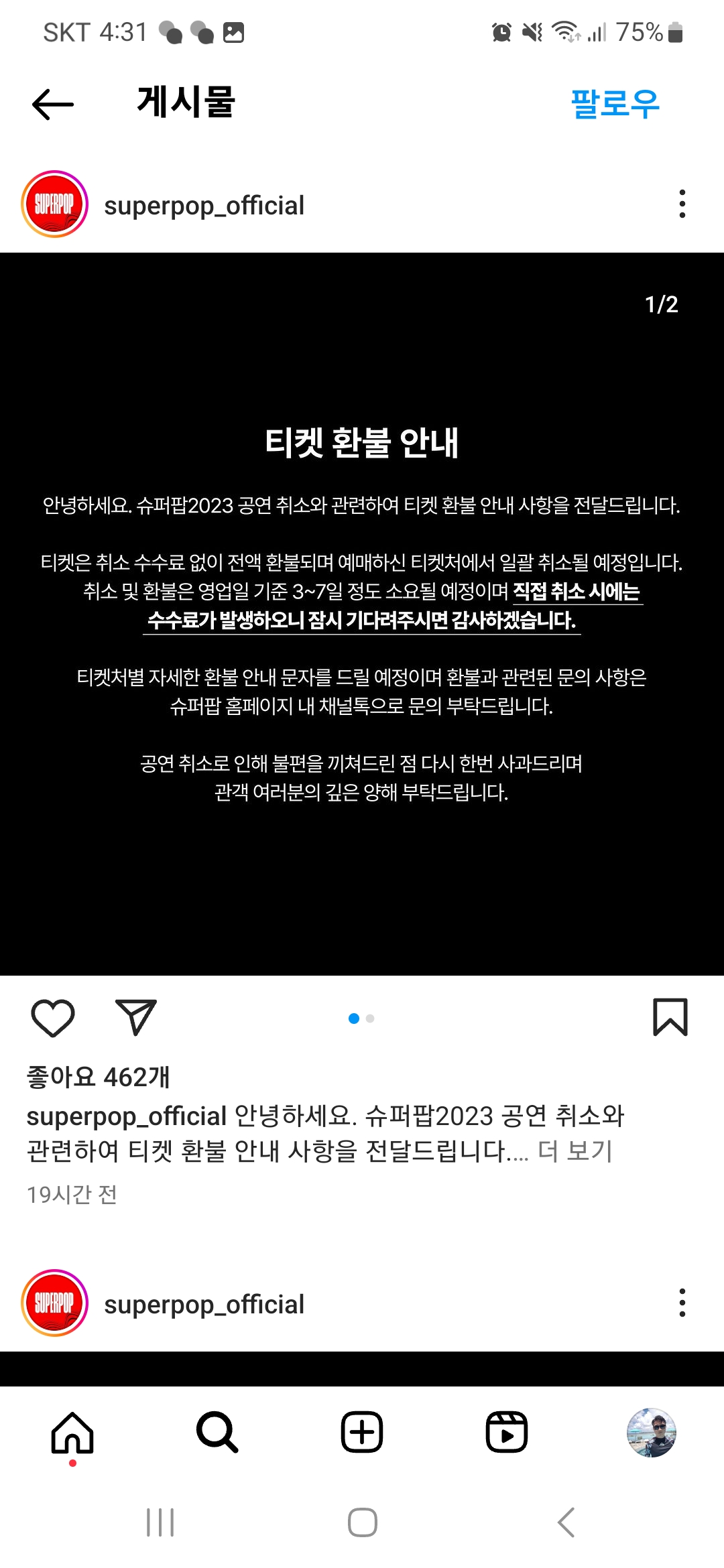 9월 23, 24일 예정되었던 슈퍼팝 2023 콘서트가 공연 이틀을 앞두고 취소되었다고 합니다.