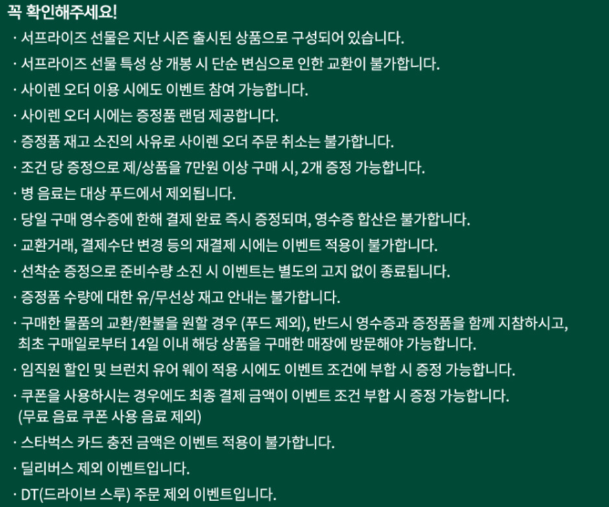 스타벅스 코리아는 9월 25일부터 추석을 맞아 스타벅스를 방문하는 고객들에게 서프라이즈 선물 증정 이벤트를 시작하였습니다. 전국 스타벅스 매장 중 선정된 600개의 거점 매장에서 제조 음료 포함 3만 5000원 이상 구매 고객을 대상으로 스타벅스 기획상품(MD) 1종을 소진 시까지 증정하며, 또 제조 음료 포함 7만원 이상 구매 시 MD 상품 2개까지 제공한다고 하니, 이벤트 진행 매장 확인하시고, 덤으로 이벤트 선물 꼭 증정받으시길 바랍니다.