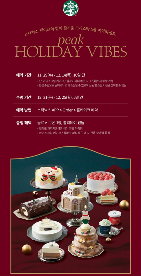 모든 상품들은 주문 시 무료 음료 e쿠폰 1장을 얻을 수 있고 젤라토 파티팩을 제외한 홀케이크 상품은 홀리데이 캔들 세트를 추가로 증정한다고 합니다. 해마다 크리스마스 케이크 수요가 늘고 있고, 심지어 호텔과 백화점의 크리스마스 케이크는 10만 원이 훌쩍 넘게 가격이 많이 올라도 예약조차 힘들다고 합니다. 믿고 마시고 먹는 스타벅스의 맛있는 크리스마스 케이크를 미리 예약하시어 성탄절, 연말 홈파티에 더욱 달콤한 시간이 되시길 바랍니다.