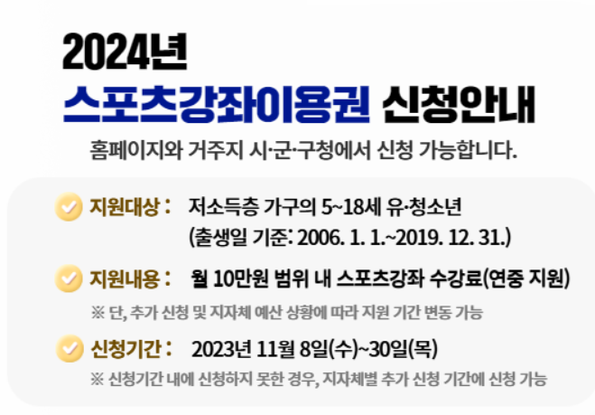 저소득층 유·청소년의 스포츠 참여기회 제공으로 평등한 스포츠 참여, 건강증진 및 사회통합 도모를 위한 2024년 스포츠강좌이용권 지원사업 신청이 시작되었습니다. 문화체육관광부가 국민체육진흥공단, 전국 지방자치단체와 함께 추진하여 취약 계층의 스포츠 참여 기회를 확대하기 위해 저소득층 유·청소년과 장애인에게 온오프라인 스포츠강좌 수강료를 지원하는 사업이며, 신청은 11월 8일부터 30일까지이며, 2024년 스포츠강좌이용권을 신청을 서두르시기 바랍니다.