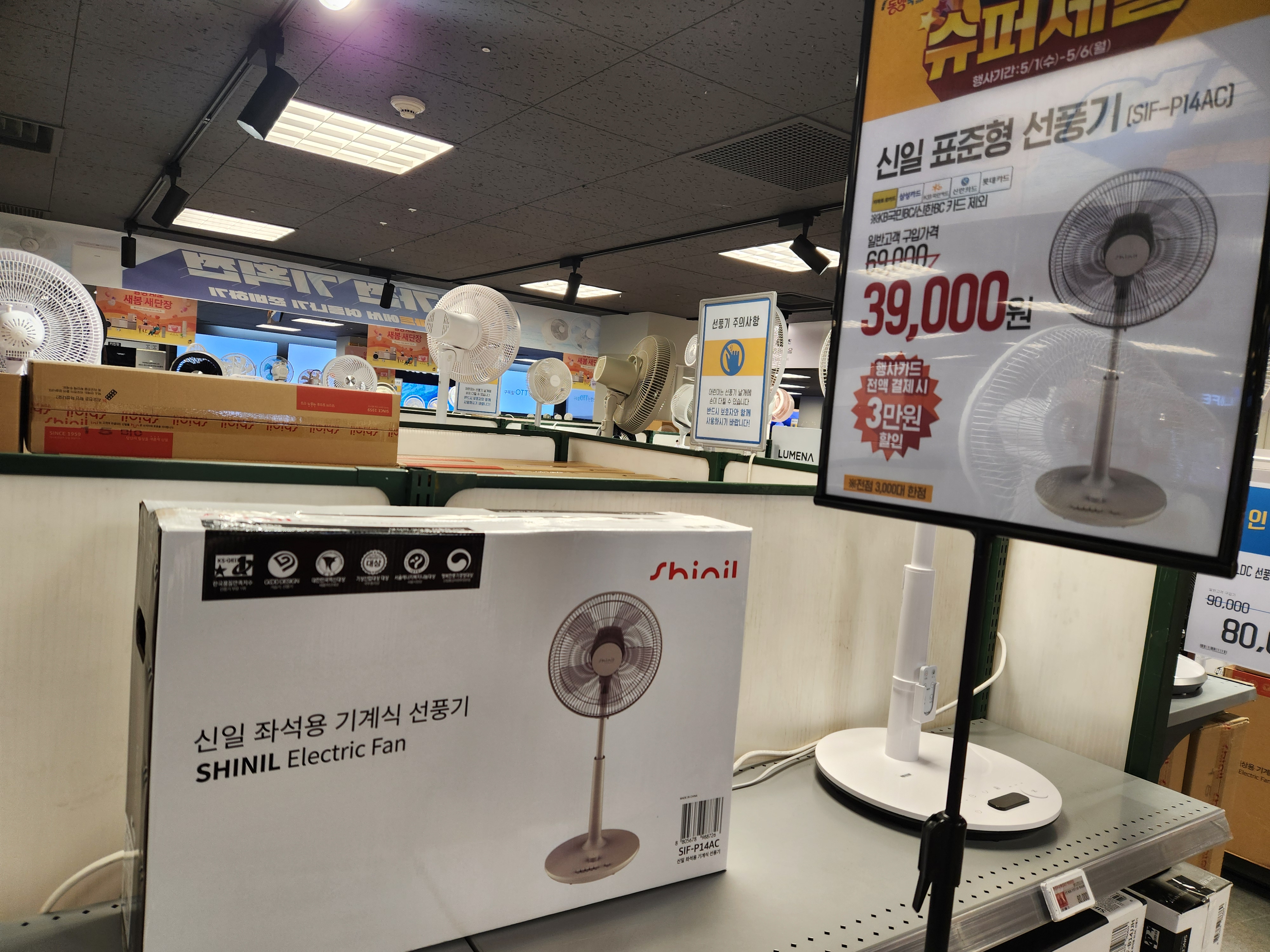 몇일 전 이마트 행사 전단을 보다가 때마침 신일선풍기가 3만 원 할인 이벤트를 한다고 접하게 되었습니다. 이마트에서 행사가 있을 때마다 평소 식품위주로 행사전단을 확인하는데, 특히, 이번에는 전단품목 중에 "신일선풍기 3만 원 할인" 문구의 제품이 눈에 확 들어왔습니다. 행사카드 삼성, KB, 신한, 롯데, 이마트 e카드 전액 결제 시 정상가격 69,000원에서 3만 원 할인된 39,000원에 구매가 가능하다 하여, 신한카드로 결제하여 39,000원에 득템 하게 되었습니다. 이마트가 집에서 가까운 편이라 도보로 방문하였고, 해당 신일선풍기 이외에도 노브랜드, 일랙트로맨 선풍기 등 5만 원 이하의 제품들을 몇몇 볼 수 있었습니다.