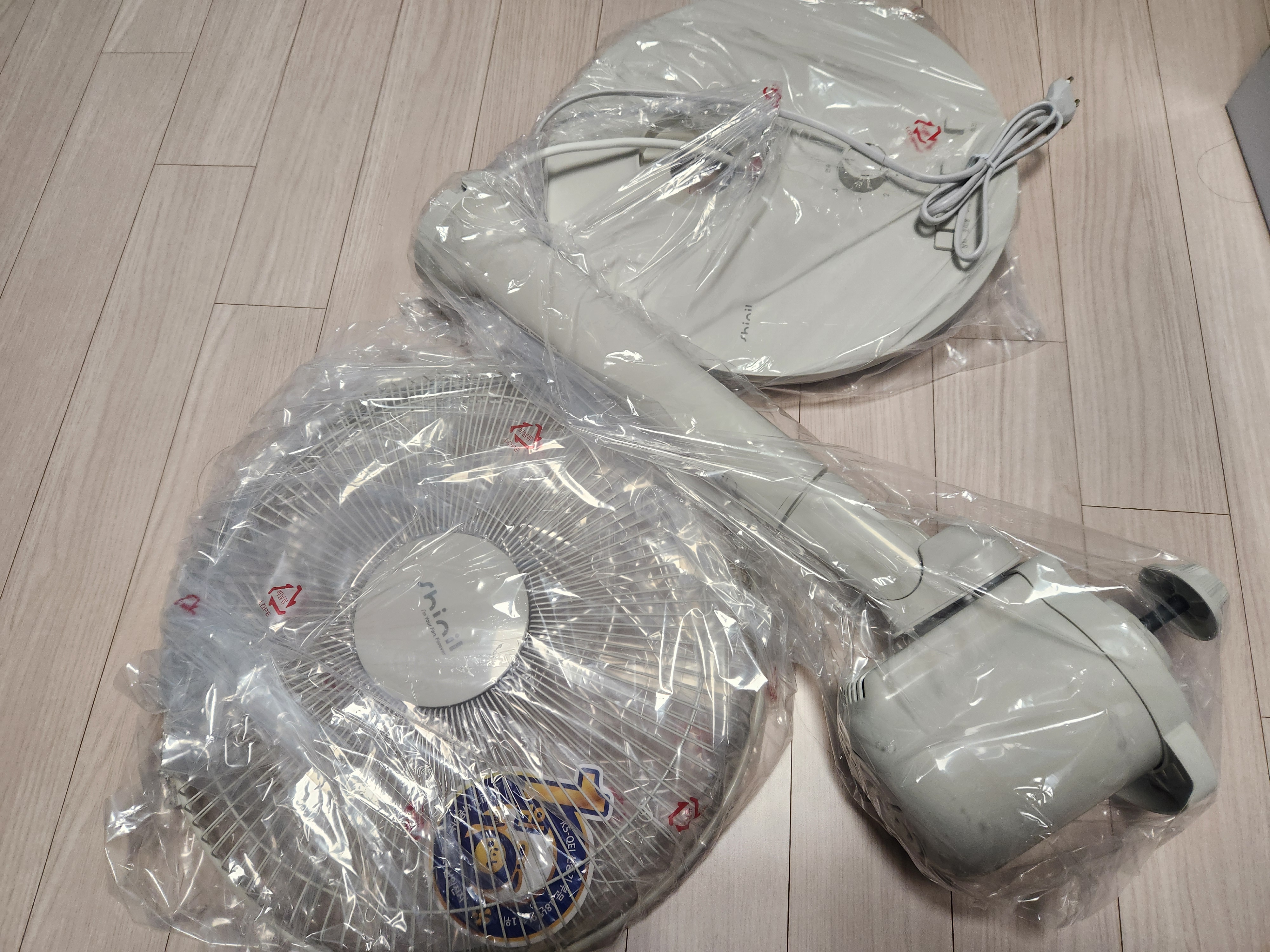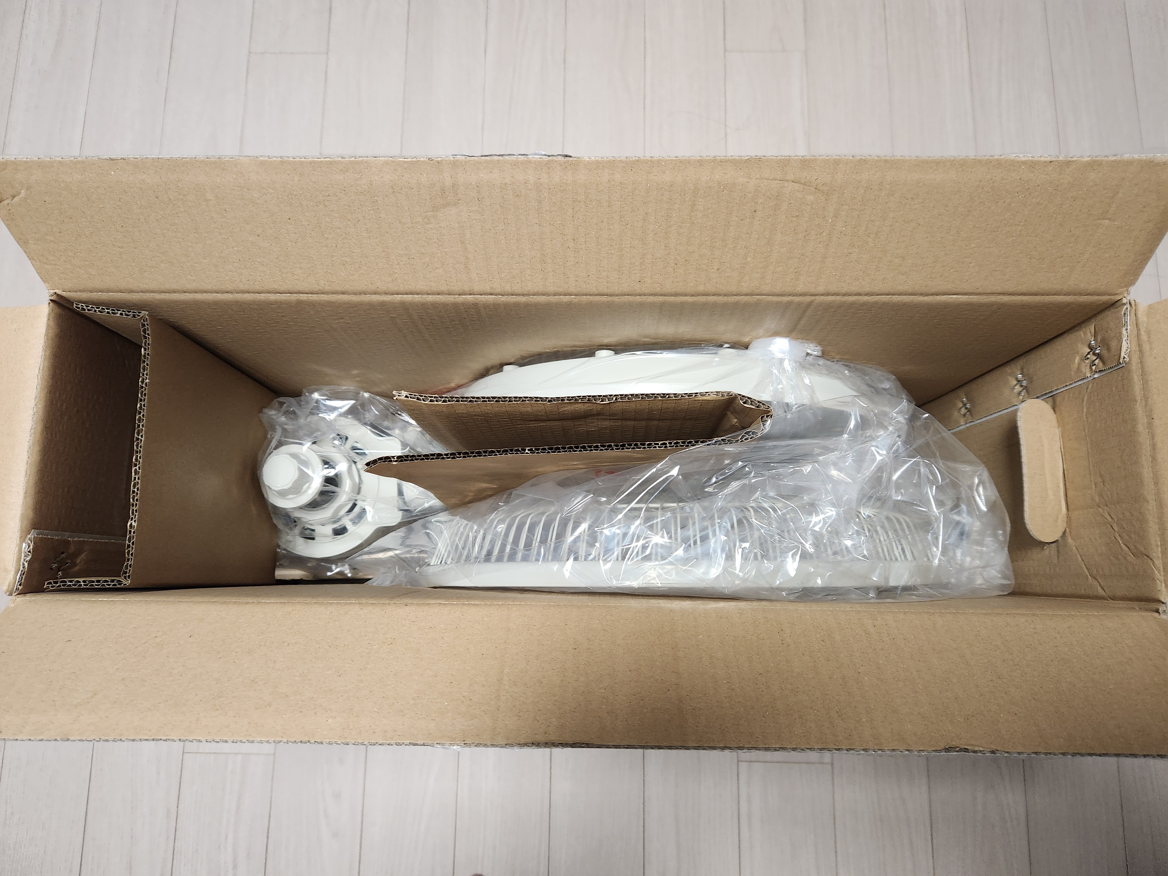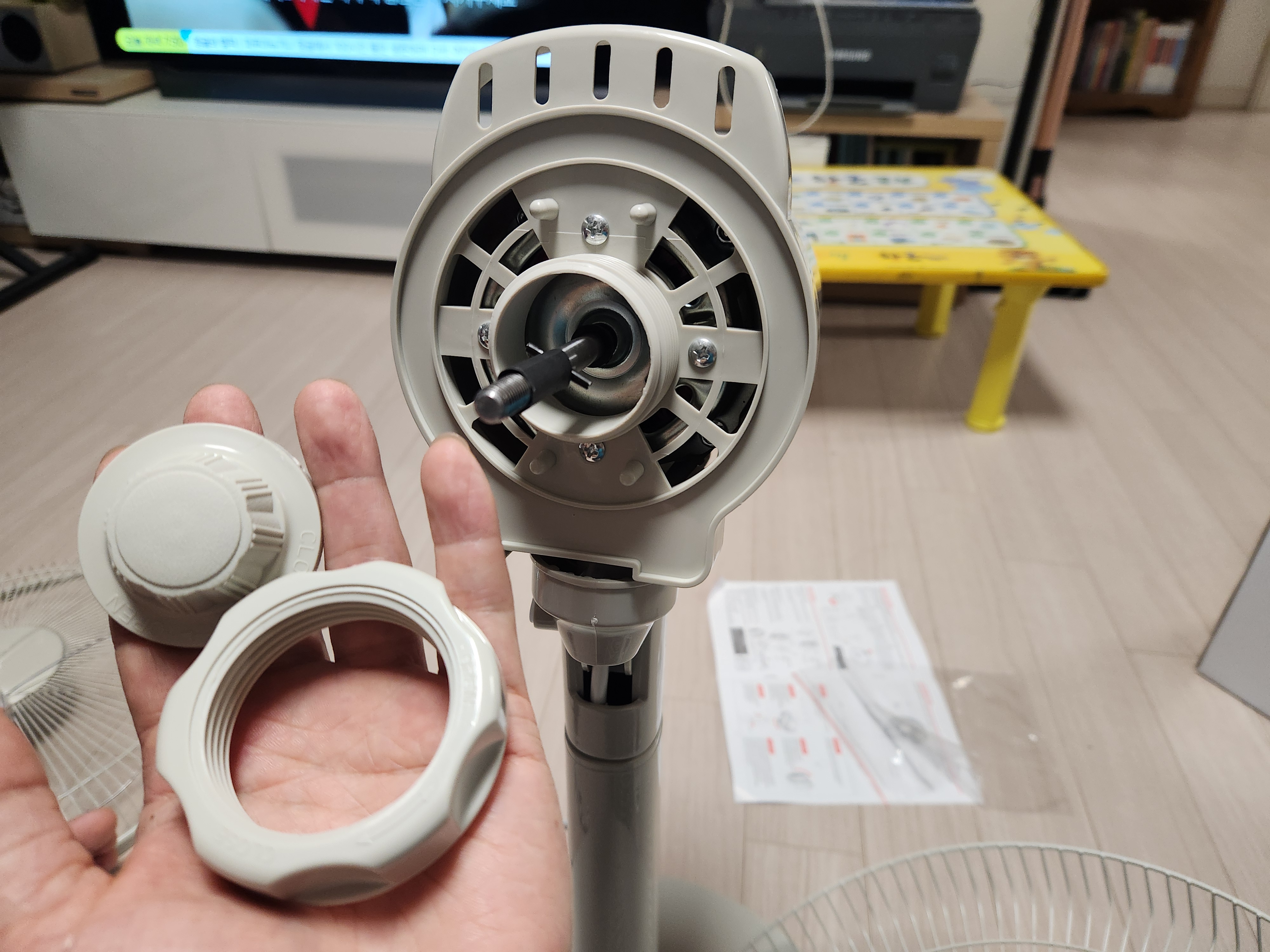 박스를 개봉했을때 모터가 달린 머리 지주와 하부 스탠드가 전선으로 연결이 되어 있었고, 날개 그리고 감싸는 전. 후망으로 크게 3 부분으로 포장되어 있었습니다.