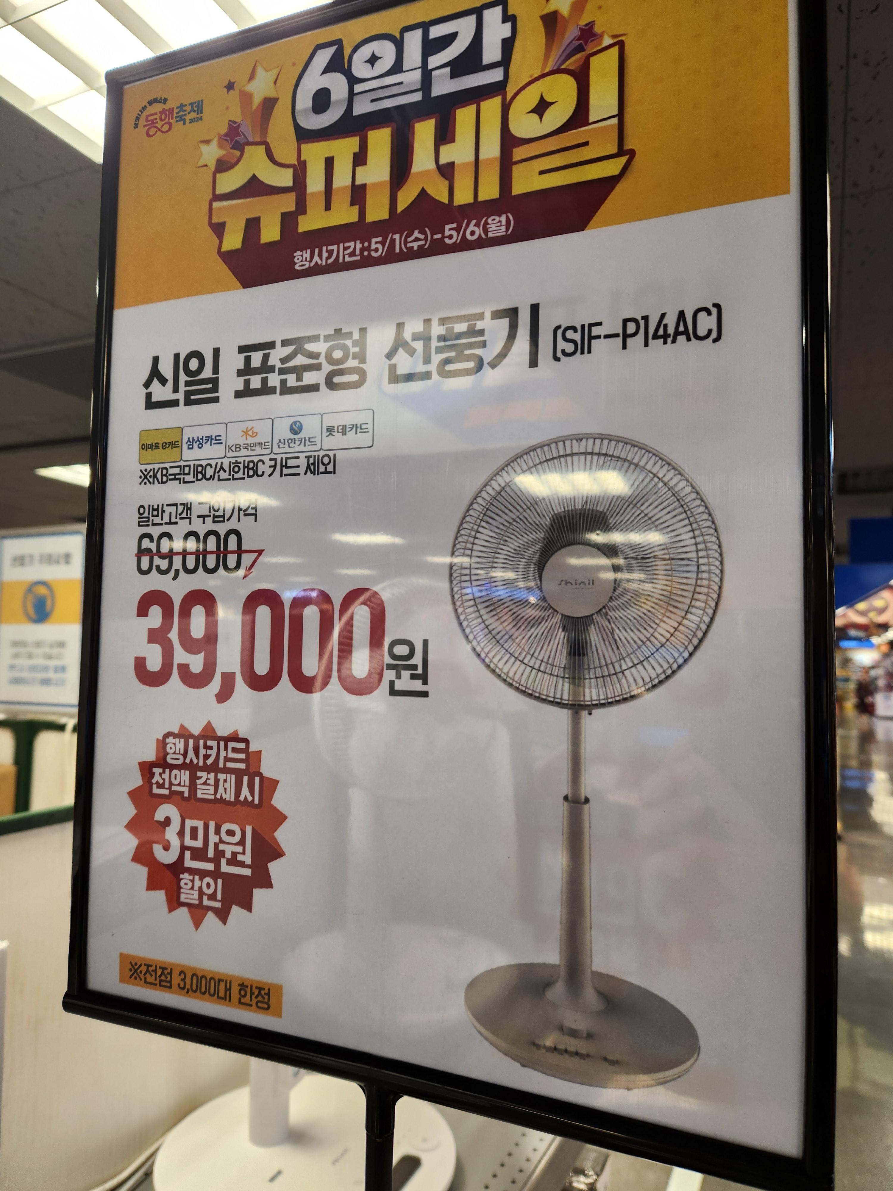 몇일 전 이마트 행사 전단을 보다가 때마침 신일선풍기가 3만 원 할인 이벤트를 한다고 접하게 되었습니다. 이마트에서 행사가 있을 때마다 평소 식품위주로 행사전단을 확인하는데, 특히, 이번에는 전단품목 중에 "신일선풍기 3만 원 할인" 문구의 제품이 눈에 확 들어왔습니다. 행사카드 삼성, KB, 신한, 롯데, 이마트 e카드 전액 결제 시 정상가격 69,000원에서 3만 원 할인된 39,000원에 구매가 가능하다 하여, 신한카드로 결제하여 39,000원에 득템 하게 되었습니다. 이마트가 집에서 가까운 편이라 도보로 방문하였고, 해당 신일선풍기 이외에도 노브랜드, 일랙트로맨 선풍기 등 5만 원 이하의 제품들을 몇몇 볼 수 있었습니다.
