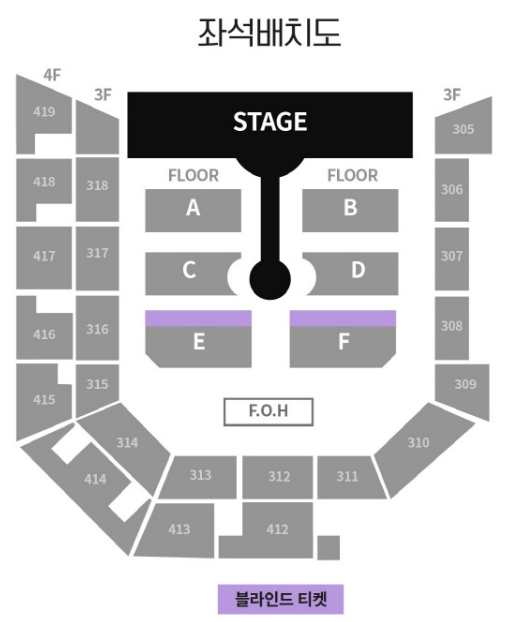 - 좌석특징 : FLOOR층은 단차가 없는 평지에 의자가 설치되며, 그외 구역은 계단식좌석이고, 일부 구역, 좌석은 난간 및 무대 시설물 또는 카메라 설치 등으로 인해 일부 시야 장애가 발생할 수 있음
