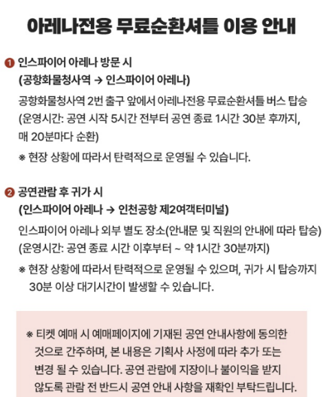 - 공연관람후귀가시 : (인스파이어 아레나 -> 인천공항 제2여객터미널) 인스파이어 아레나 외부 별도 장소(안내문 및 직원의 안내에 따라 탑승), (운영시간: 공연 종료 시간 이후부터 ~ 약1시간 30분까지) , 현장 상황에 따라서 탄력적으로 운영될 수 있으며, 귀가 시탑승까지 30분 이상 대기시간이 발생할 수 있습니다.