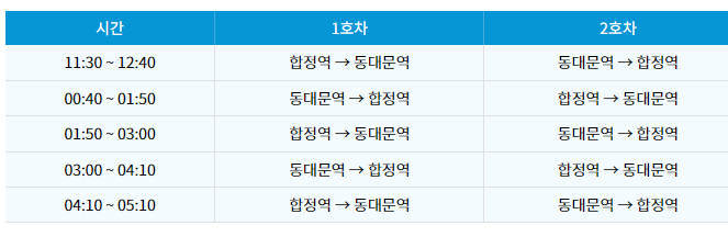 대학가, 대형 쇼핑몰 등이 밀집해 심야 이동이 많은 합정역~동대문역 중앙버스전용차로구간 9.8km을 순환하게 되며 월요일~금요일, 23시 30분~다음날 5시 10분까지 운행합니다.