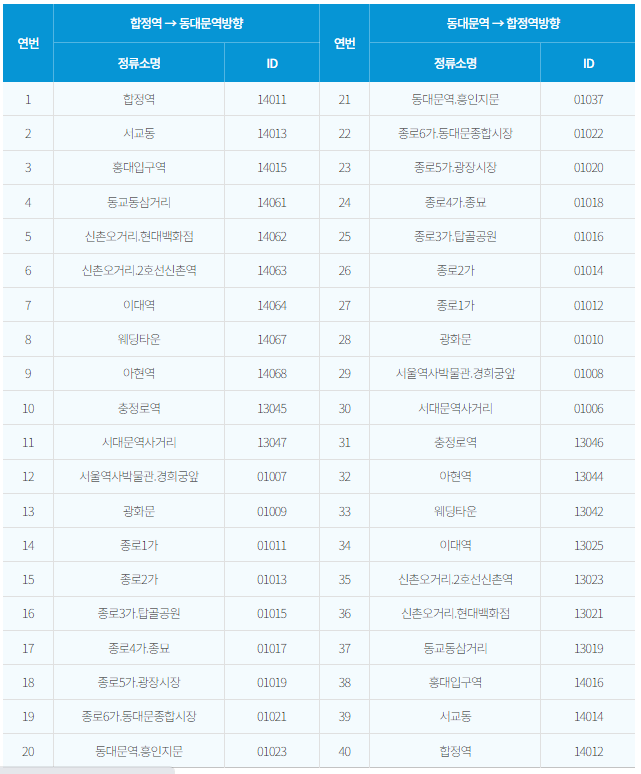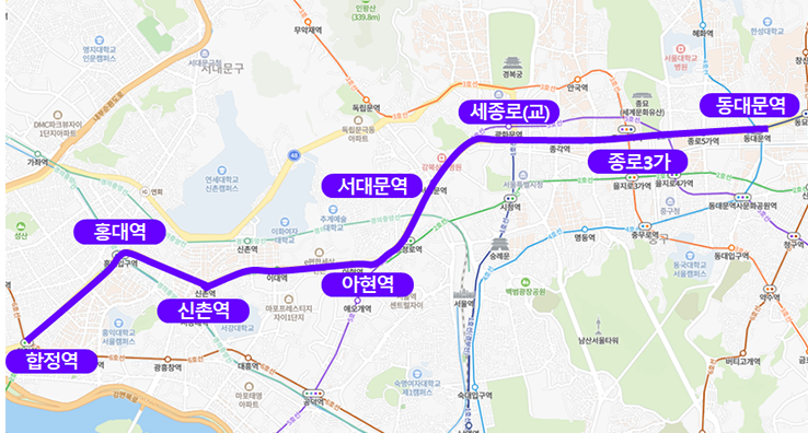 : 합정역~홍대입구역~신촌역~아현역~서대문역~세종로(교)~종로1가~종로5가~동대문역(흥인지문)