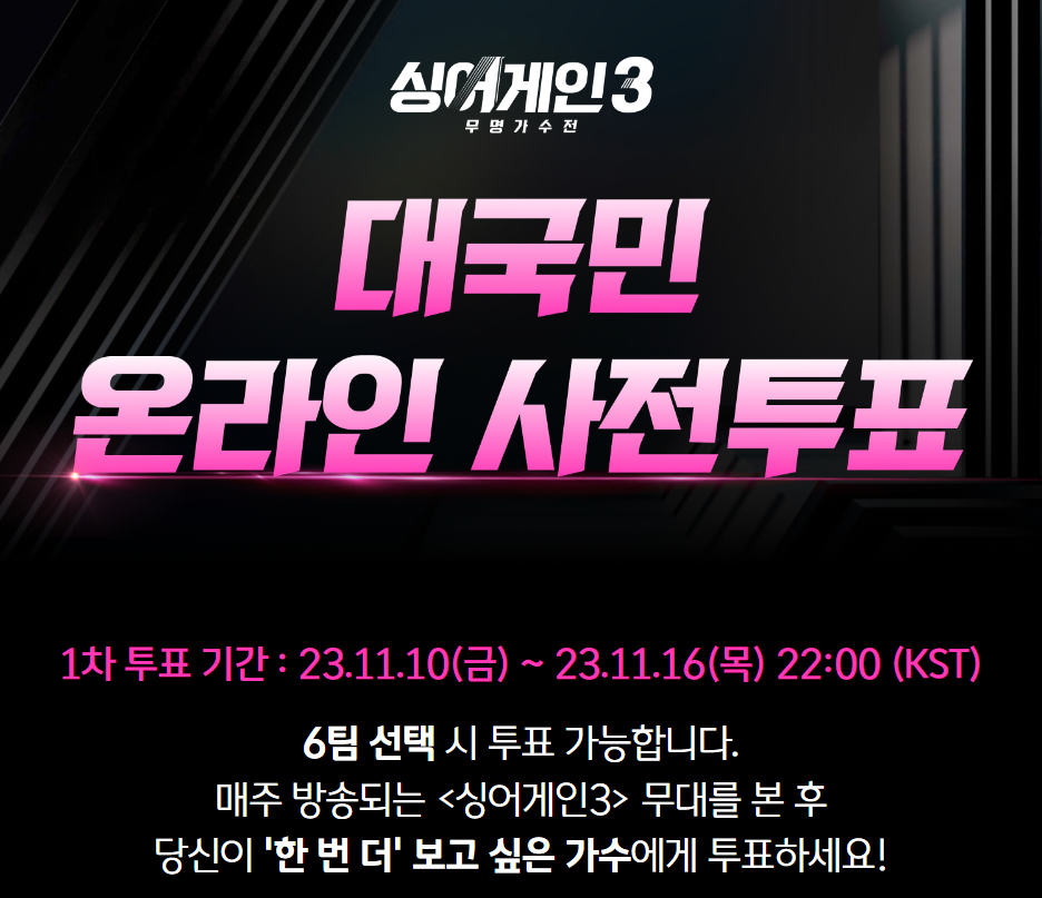 '싱어게인3'는 단순히 가수들의 경연 무대를 넘어, 다시 노래할 수 있는 기회를 제공함으로써 모든 분들에게 희망과 꿈을 이야기하는 감동과 음악이 있는 특별한 프로그램입니다. 감동을 느끼는 대중의 관심이 프로그램을 더욱 빛나게 할 것입니다. 싱어게인3'의 참가자들은 대중의 소중한 투표가 그들의 음악 인생을 바꿀 수 있는 기회가 될 것입니다. 투표 방법은 매우 간단하니, 참여를 망설이지 마시고 여러분이 좋아하는 가수에게 힘을 실어 주셨으면 합니다.