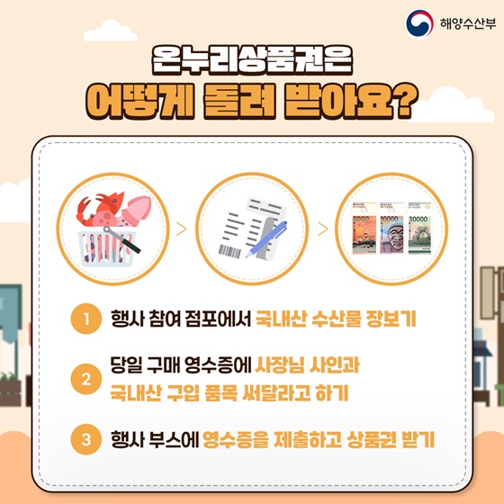 행사점포에서 수산물 구입 후 영수증 앞면에 점포주 서명& 국내산 구입품목 기재를 받아 온누리상품권 환급행사장에 방 문하여 영수증 확인 후 온누리상품권으로 환급 지급받으시면 됩니다.