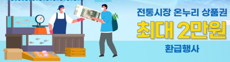 일본 후쿠시마 원전 오염수 방류 관련 대비 수산물 소비 촉진 및 전통시장 활성화를 위해 해양수산부에서 전통시장 온누리 상품권 환급행사를 진행 합니다. 전통시장에서 우리 수산물을 구매하면 한 사람당 최대 2만 원, 금액의 30% 까지 온누리상품권으로 환급받는 혜택을 받을 수 있습니다.