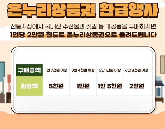 온누리상품권 환급 행사는 해양수산부 수산물 상생 할인 지원 사업의 하나로, 후쿠시마 원전 오염수 방류로 위축된 소비심리를 회복하기 위해 국내산 수산물 소비 촉진을 위해 추진하는 행사입니다.