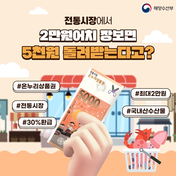 9월 21일부터 27일까지 전통시장에서 농축수산물을 사면 구매 금액의 최대 30~40%를 온누리상품권으로 돌려받을 수 있습니다. 추석을 일주일 앞두고 농림축산식품부·해양수산부·중소벤처기업부