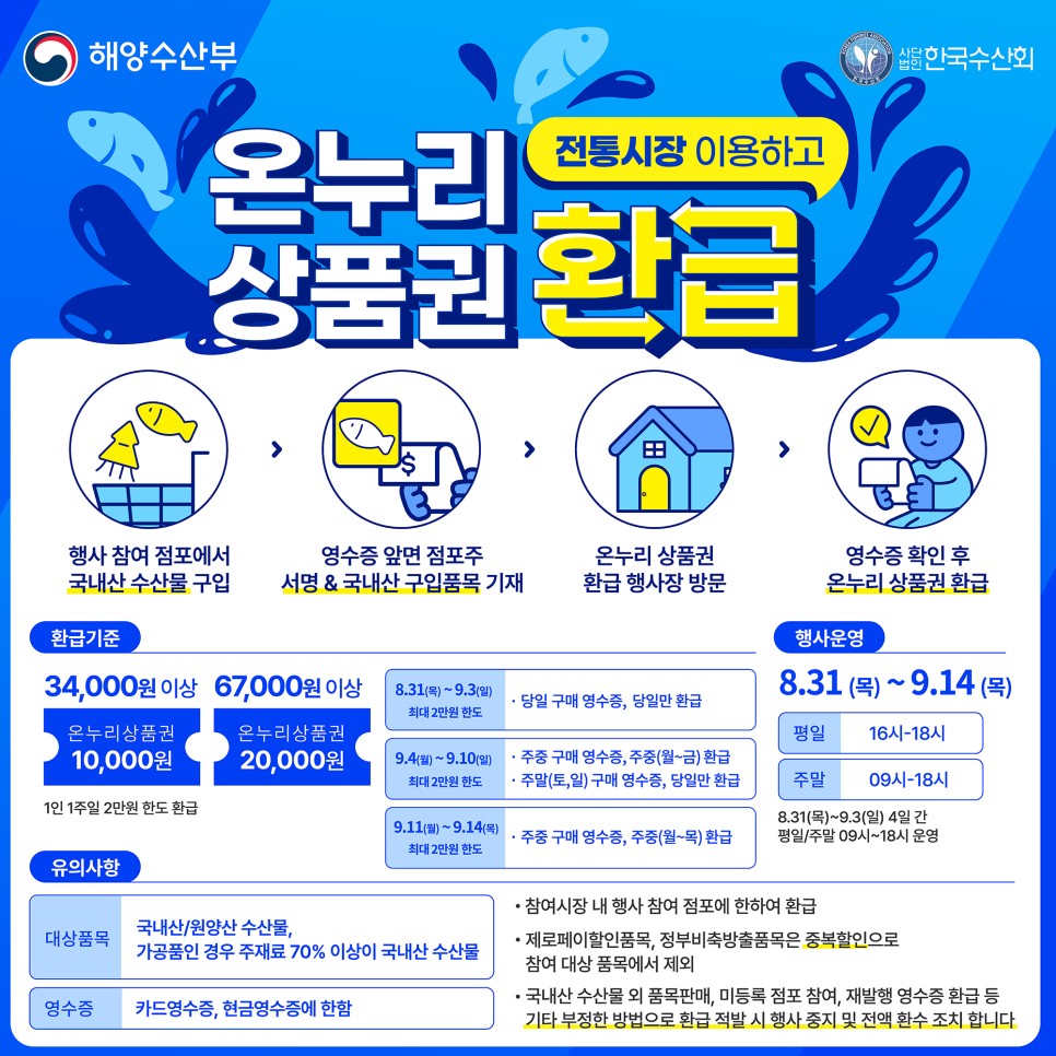 행사점포에서 수산물 구입 후 영수증 앞면에 점포주 서명& 국내산 구입품목 기재를 받아 온누리상품권 환급행사장에 방 문하여 영수증 확인 후 온누리상품권으로 환급 지급받으시면 됩니다.