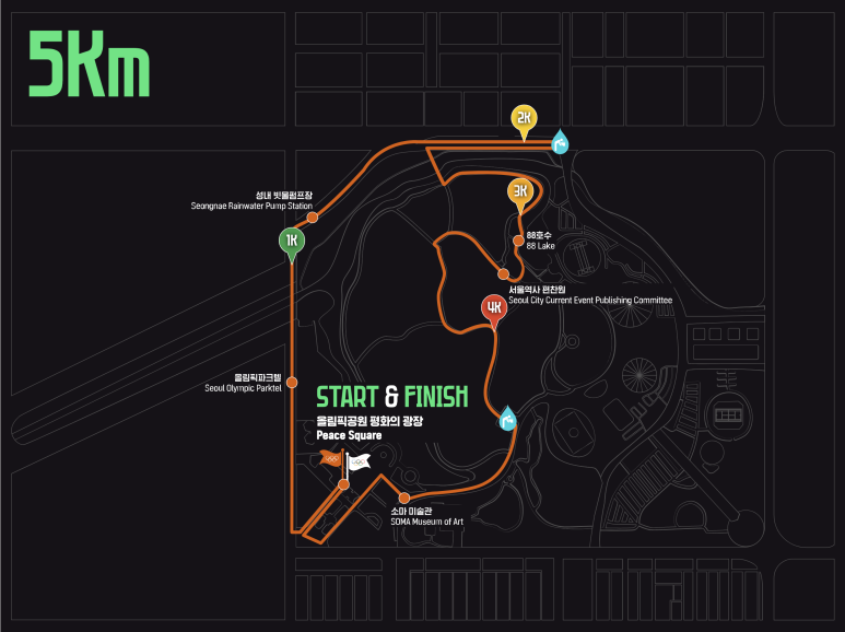 올림픽공원 평화의 광장 (START) ►서울올림픽파크텔 - 성내빗물펌프장 - 88 호수 - 서울 역사 편찬원 - 소마 미술관 - 올림픽공원 평화의 광장 (FINISH)