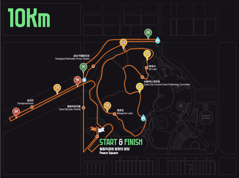 - 2km, 4.5km 지점에 생수와 스포츠 음료가 제공되며, 6.5Km 지점에 물수건이 제공됩니다.