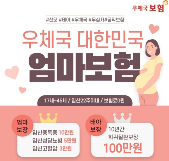 과학기술정보통신부 우정사업본부에서 자녀의 희귀 질환 등을 무료로 보장하고, 산모의 건강하고 안정적인 출산부터 자녀의 성장 지원을 위한 공익보험으로 무배당 우체국대한민국엄마보험2039를 출시하였습니다. 보험료는 전액 우체국이 지원하며, 병력이나 건강 상태와 관계없이 연령과 임신 조건만 맞으면 누구나 가입가능하고 10년간 자녀의 희귀 질환 보장, 임신 22주 이내 특약가입 산모의 임신질환도 보장합니다. 정부에서 저출산 문제 해결에 기여하고 공적 역할을 강화하기 위해 출시한 공익보험으로 살펴보시고 조건에 부합되시는지 확인하시기 바랍니다.