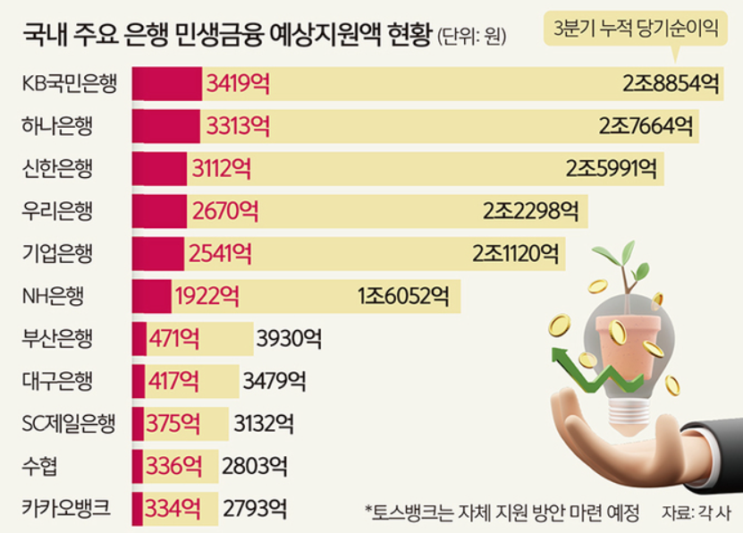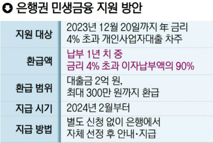 은행들이 고금리 대출금을 갚기 어려운 소상공인과 자영업자에게 1인당 최대 300만 원의 이자를 현금으로 돌려준다고 합니다. 지원 대상은 연 4%가 넘는 금리로 개인사업자 대출을 받은 차주입니다. 은행연합회, 금융위원회, 금융감독원 및 20개 사원은행은 21일(목) 오전 은행회관에서 간담회를 개최하고 자영업자ㆍ소상공인 등을 위한 2조 원+α 규모의 「은행권 민생금융지원방안」을 발표하였습니다. 관련하여 이자환급을 받을 수 있는 대상과 범위에 대해 알아보도록 하겠습니다.