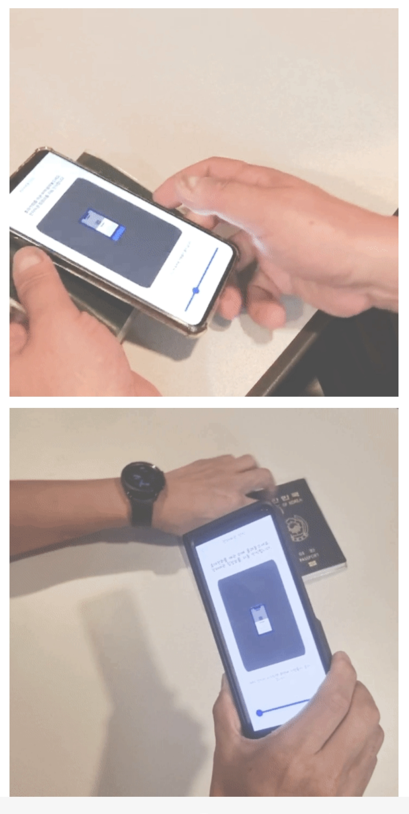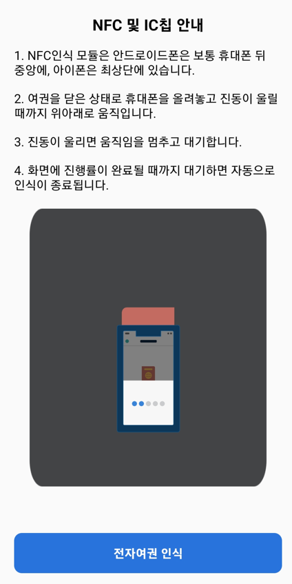 여권을 닫은 상태로 휴대폰을 올려놓고 진동이 울릴 때까지 위아래로 움직이며, 진동이 울리면 멈추고 대기하면 화면에 진행률이 완료될 때까지 대기 후 자동으로 인식이 종료됩니다.