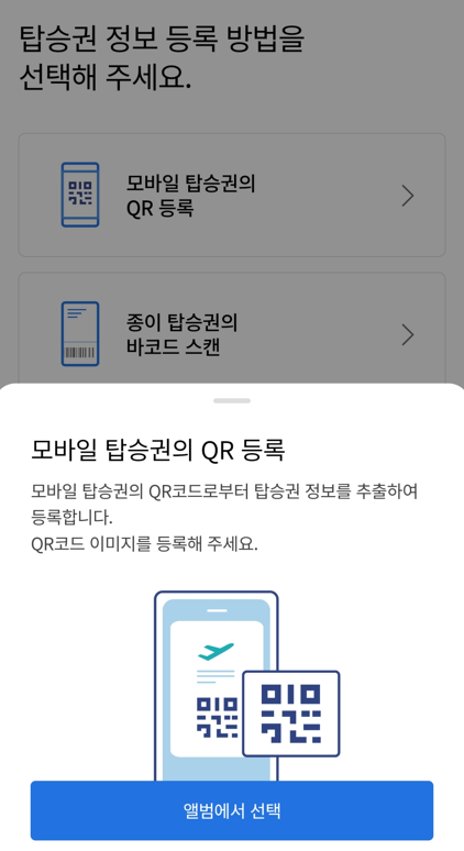 탑승권 등록은 모바일 탑승권과 종이 탑승권 둘 다 등록이 가능합니다. 모바일 탑승권은 QR 등록, 종이 탑승권은 바코드 스캔으로 간단히 등록이 됩니다.
