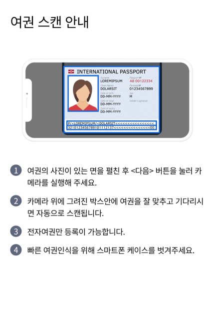 여권의 사진이 있는 면을 펼친 후 <다음> 버튼을 눌러 카메라를 실행하면, 카메라 상에 보여지는 사각박스 안에 여권이 잘 맞춰지면 잠시 후 자동으로 스캔이 가능합니다.