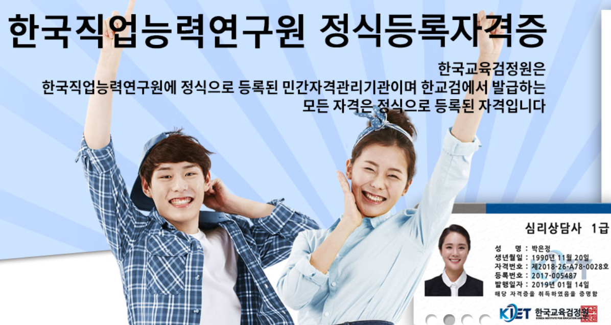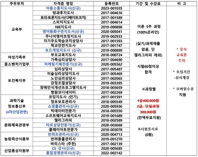 본 교육원의 자격증은 등록관리 기관인 "한국직업능력연구원"에 등록된 민간자격증입니다. 아동소통지도사, 영어동화구연지도사, 보드게임지도사, 메케팅기획전 문가, 쇼핑몰관리사, 타로상담전문가, 반려조관리사, CS강사, 품질경영관리사 등이 이번교육에 신규로 진행이 됩니다. 100% 온라인 이론 5주 과정이며, 교육 이수 후 시험응시를 하여 60점 이상이면 자격증을 취득할 수 있습니다. 시험 응시료 또한 무료로 진행이 됩니다.