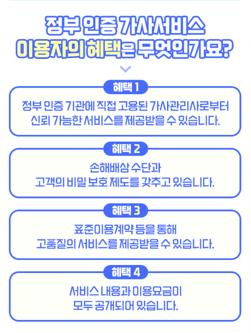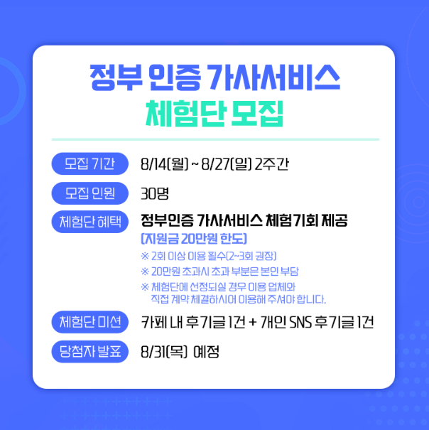 - 체험단 혜택 : 정부인증 가사서비스 무료 체험 기회 제공(지원금 20만 원 한도)